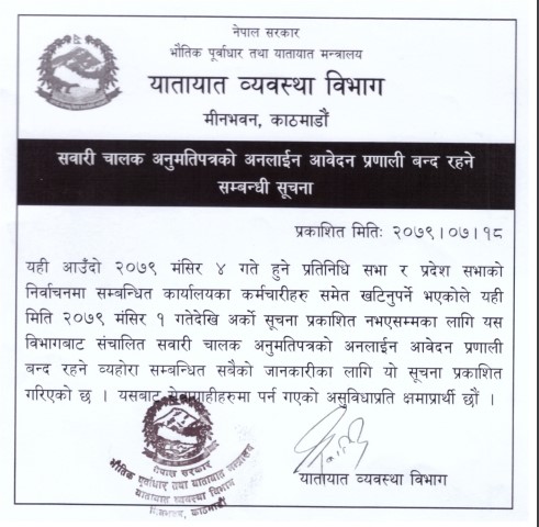 मंसिर ४ मा हुने प्रतिनिधि सभा र प्रदेश सभा चुनावका लागि कर्मचारी खटिएकोले कार्यालयको सेवा प्रभावित हुने भएको छ।मंसिर १ गतेदेखि अर्को सूचना जारी नहुन्जेलसम्मका लागि अनलाइन आवेदन बन्द गरिएको विभागले जानकारी दिएको छ।